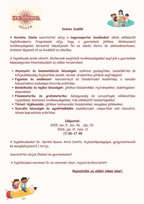 A 2025/2026-os tanévben is meghirdetjük iskolába hívogató és előkészítő foglalkozásainkat.