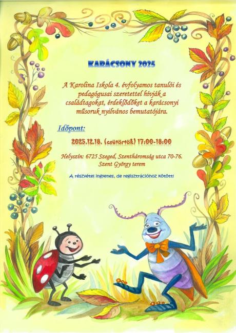 Szeretettel hívjuk a családtagokat és minden érdeklődőt a 4. évfolyam karácsonyi műsorára 2025. december 18-án 17:00 órakor.