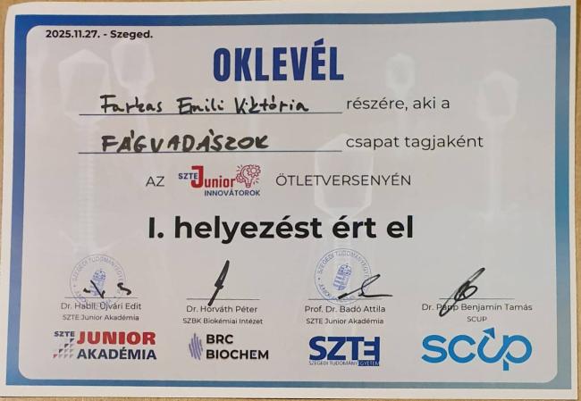 2025/2026 Farkas Emili 10.B diákunk országos döntőbe jutott az SZTE Junior Innovátorok Ötletversenyen a csapatával. Csapattársai más iskola diákjai, az első körből egyéni pályamunkával jutottak be és ebben a körben alakítottak csapatot. 2025. december 02. Gimnázium versenyek Büszkeségeink