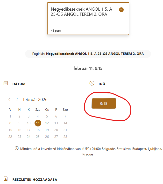 - Kiválasztott tanóra szövegére kell menni. Ekkor megnyílik a foglalási felület.