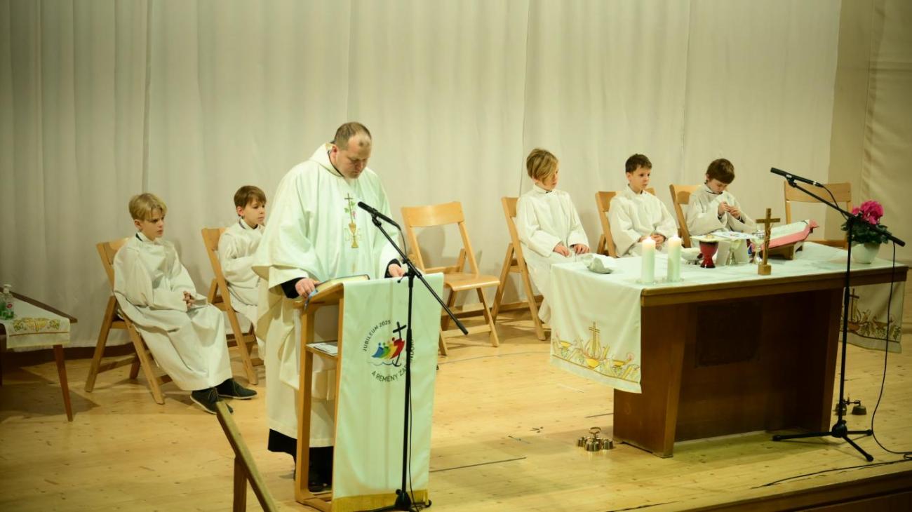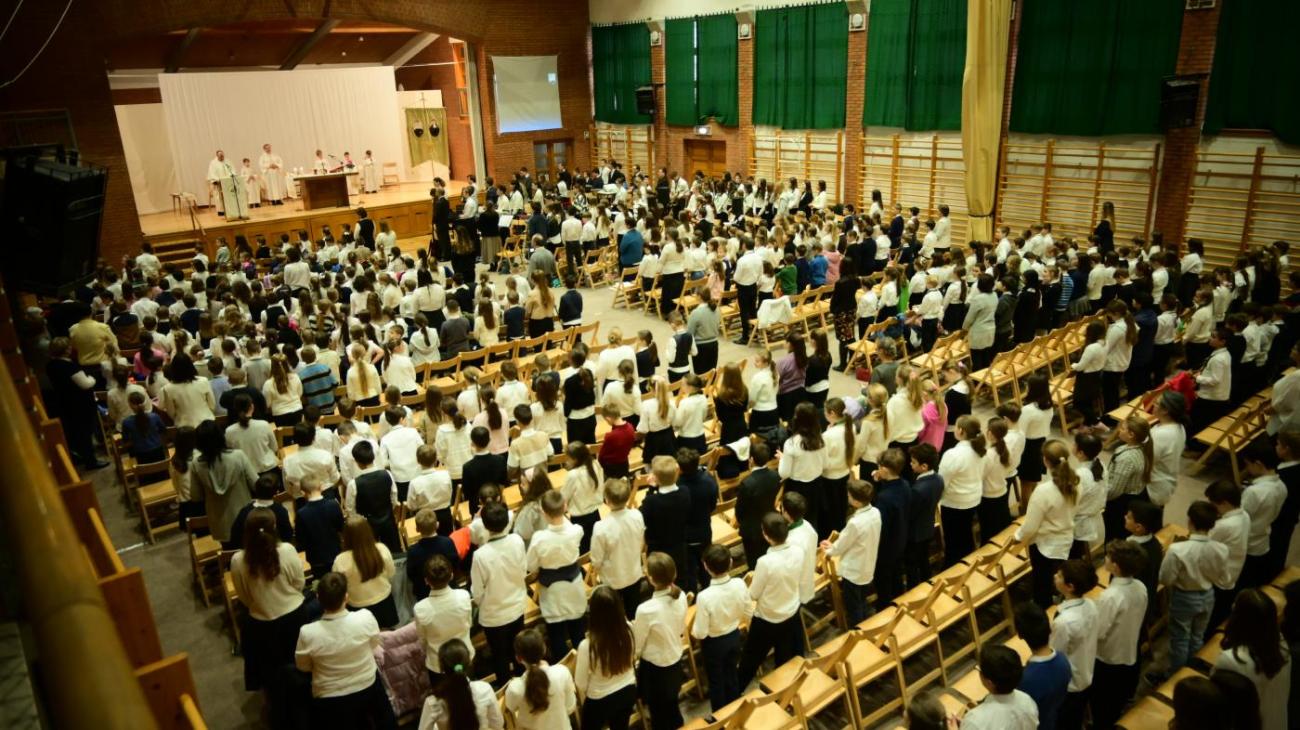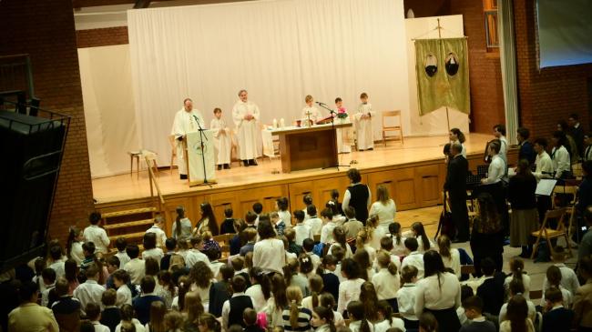 A napot szentmisével kezdtük. 8 órától az 1-6. évfolyam, míg 9 órától a 7-12. évfolyam tanulói voltak jelen a Szent György teremben. Mind a két szentmisét Ft. Forgó Miklós eleki plébános atya celebrálta, a zenei szolgálatot diákjaink adták Szűcs Péter tanár úr és Szűcsné Terhes-Kis Gabriella tanárnő vezetésével.