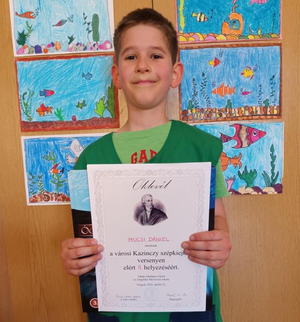 Mucsi Dániel, iskolánk 4.c osztályos tanulója a Tabán Általános Iskola és AMI által rendezett városi Kazinczy Szépkiejtési Versenyen II. helyezést ért el. Ezzel továbbjutott a vármegyei fordulóba, melyet április 28-án, kedden rendeznek Hódmezővásárhelyen.
