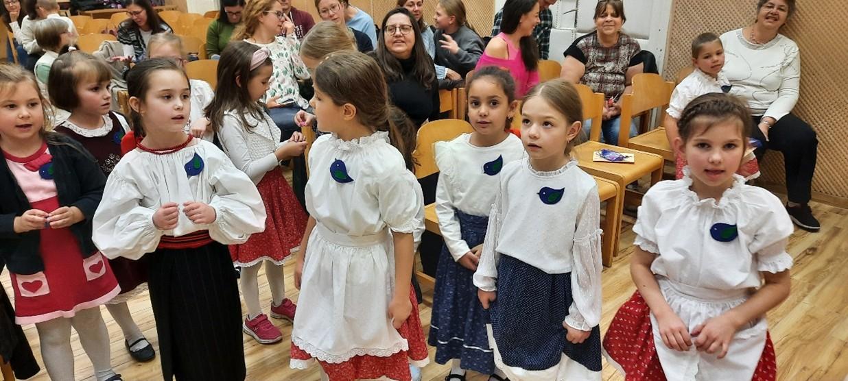 A hűvös, őszi délutánt megszépítették a mosolygós, bátor, lelkes és felkészült óvodások, akik a zsűri előtt (Királyné Kocsis Magdolna, Noé Gabriella, Vilmos Zita) nagy örömmel mutatták be népdalcsokraikat.