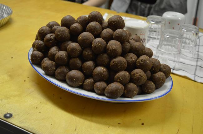 díszítés. A golyók selymes csokoládé bevonatot kaptak, amelyre mindenki saját ízlése szerint varázsolt ünnepi díszeket. Előkerültek a rózsaszín és kék díszítések, az apró cukorgolyók, cukor hópelyhek és a művészi fehércsokis csíkozás is. Nem volt