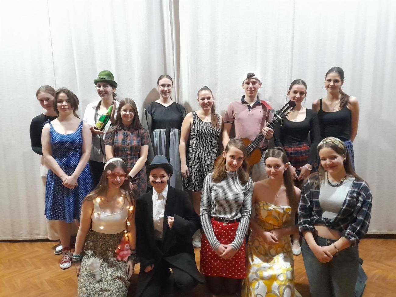 kötetlen társasjátékozással töltöttük. Az este fénypontja pedig a már jól ismert, hagyományos koleszos farsangi színház volt. A diákok az adott korszak ruháiba öltözve, saját ötleteik alapján megalkotott jelenetekkel készültek. A színpadon megelevenedtek a táncdalfesztiválok és majálisok hangulata, bepillantást nyerhettünk egy korabeli család hétköznapjaiba, és azt is láthattuk, hogyan találkozott az akkori magyar kultúra a nyugati hatásokkal. A színházi élményből nevelőink sem maradtak ki: Csányi-Bózsó Tímea és Gellér Alíz egy meglepetés előadással is készültek a diákok számára. Zágon István A nyuszi című