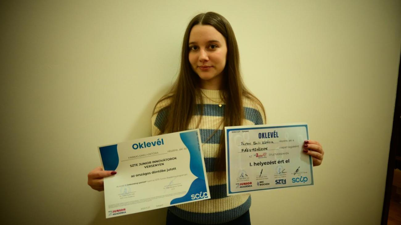 2025/2026 Farkas Emili 10.B diákunk országos döntőbe jutott az SZTE Junior Innovátorok Ötletversenyen a csapatával. Csapattársai más iskola diákjai, az első körből egyéni pályamunkával jutottak be és ebben a körben alakítottak csapatot. 2025. december 02. Gimnázium versenyek Büszkeségeink